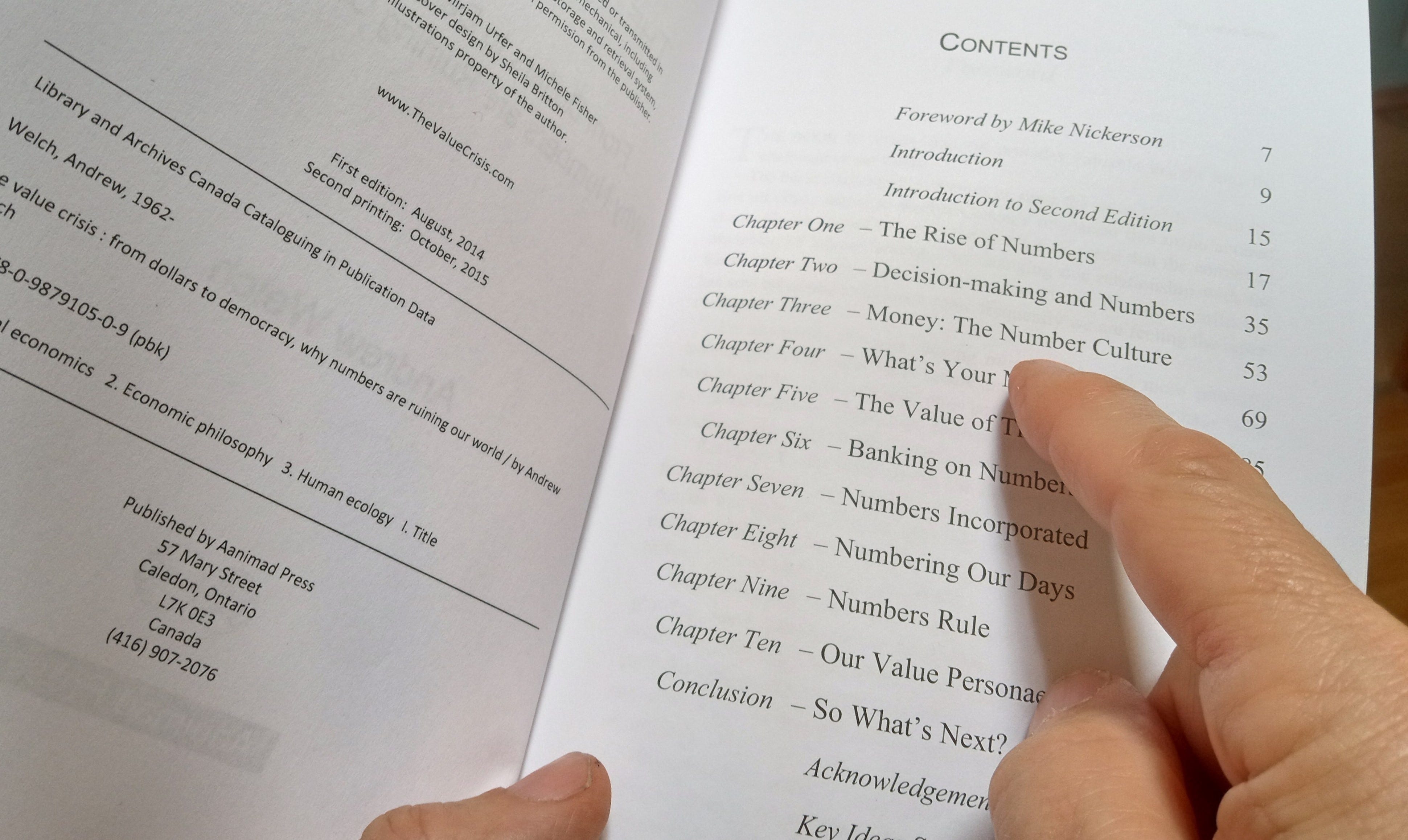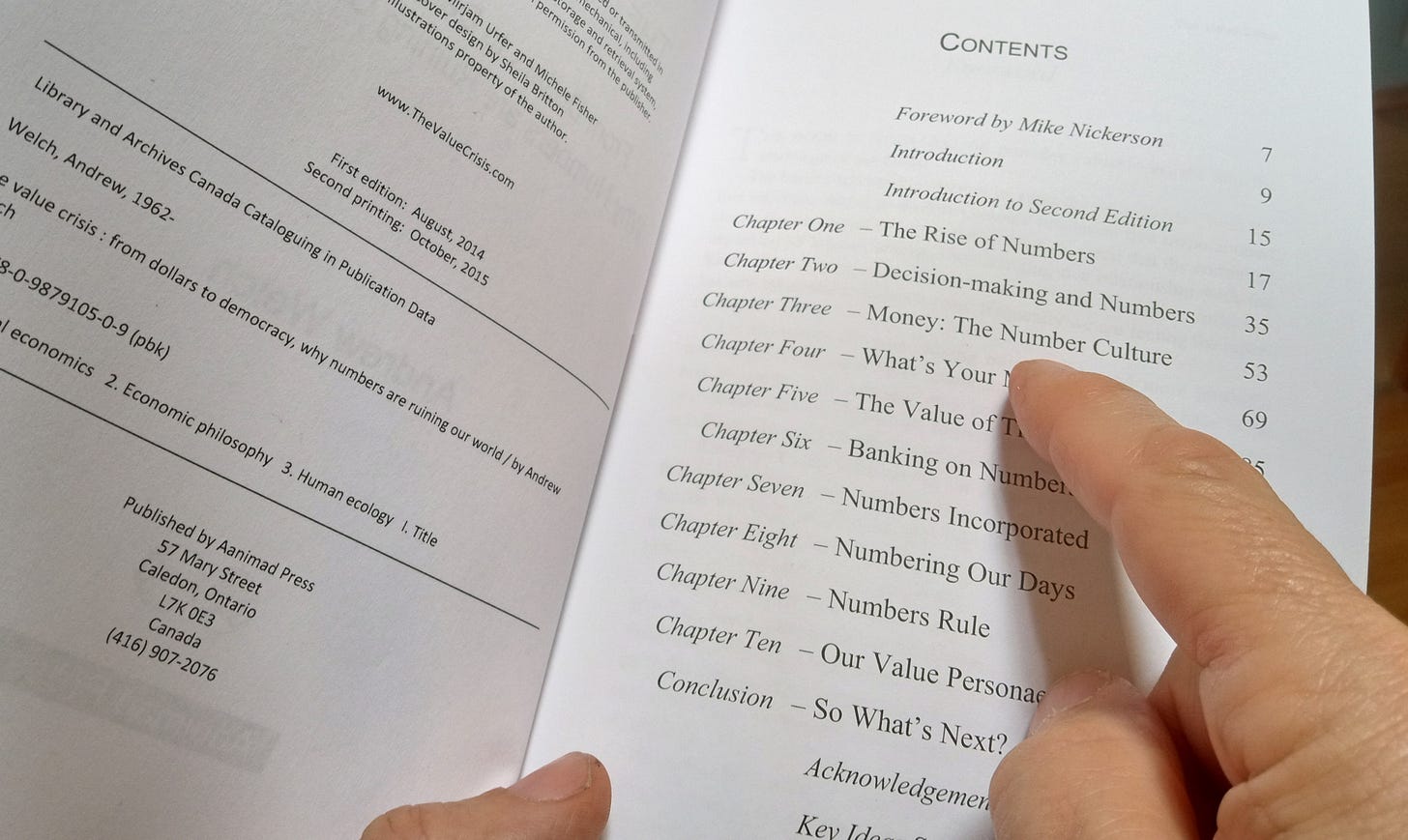 Some people think that the crisis is around how we value money, so I have to explain why the value crisis is much more than that. I also talk about how numbers relate to happiness.